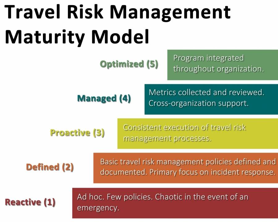 Er zijn door de wetgever criteria gesteld waar de werkgever zich aan moet houden op het gebied van Duty of Care. Deze wetgeving is (afhankelijk van het land) vaak beperkt en iedere organisatie heeft natuurlijk de ruimte om dit zelf aan te vullen. In de Travel Risk Management strategie benoem je hoe je hiermee omgaat. Het is belangrijk voor een organisatie om het beleid te toetsen bij vergelijkbare organisaties. Een TMC (Travel Management Company) kan hierbij helpen. De ene organisatie volgt bijvoorbeeld reizigers via een tracking systeem, de andere organisatie stuurt dagelijks updates naar reizigers over nieuwe risico’s terwijl andere organisaties zich beperken tot de wetgeving. Het is belangrijk om als organisatie een benchmark te hebben wat de standaard is en waar je als organisatie staat. Een goede benchmark is het Travel Risk Management Maturity Model (ontwikkeld door de National Business Travel Association). Welke plek neemt uw organisatie in als u dit vergelijkt met branchegenoten?